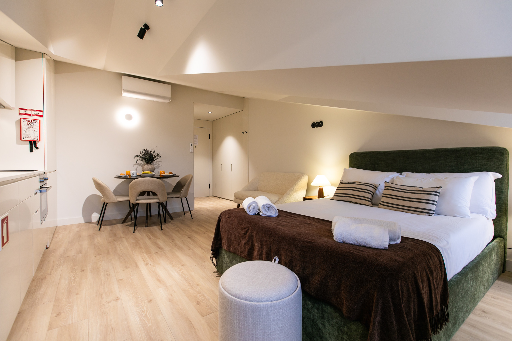 Studio localizado no 4º andar com acesso por elevador com uma cama de casal, Kitchenette totalmente equipada com fogão, mini-frigorífico com congelador, torradeira, chaleira elétrica, máquina de café e todos os utensílios de cozinha, mesa de refeições, TV e Internet por Wi-Fi, casa de banho completa com chuveiro. Zona comum no 4º andar com máquina de lavar e secar roupa.