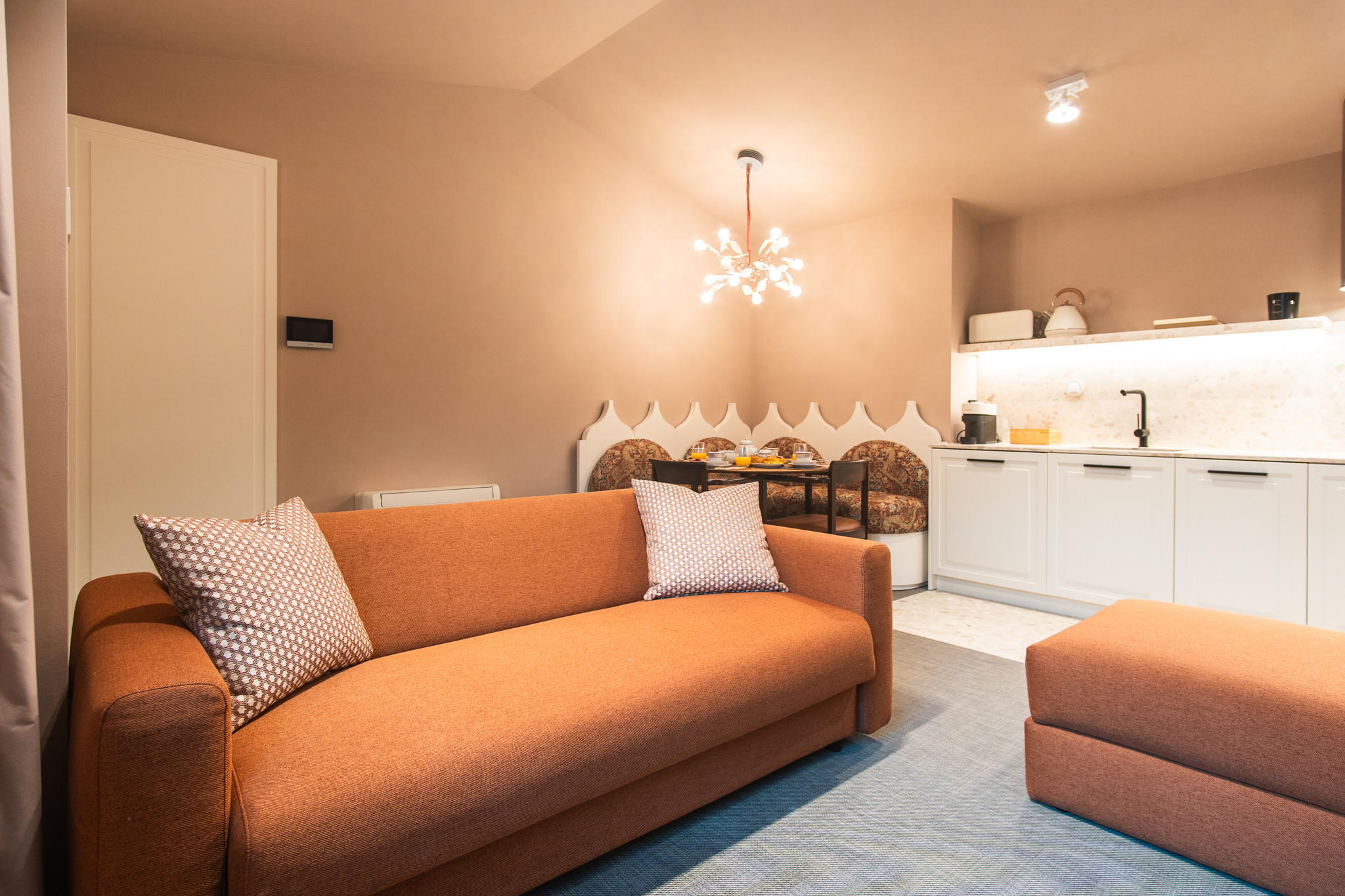 El apartamento E está situado en la 3ª planta, con acceso por ascensor y escaleras, totalmente equipado y amueblado, ideal para parejas que deseen disfrutar de una estancia agradable en el centro histórico de la ciudad. Cuenta con 1 dormitorio tipo suite con cama de matrimonio y ducha, kitchenette totalmente equipada con cocina, horno, tostadora, hervidor eléctrico, frigorífico con congelador y todos los utensilios de cocina, lavadora, mesa de comedor y sala de estar con sofá cama, TV e Internet Wi-Fi.